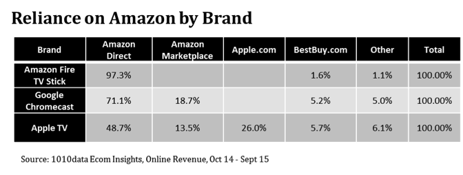 In base alle stime di 1010data, pubblicate nel rapporto dell’azienda sul mercato USA, il mercato dei dispositivi per lo streaming televisivo abbraccia in maniera massiccia il sito e-commerce USA: negli ultimi 12 mesi, il 60 per cento delle vendite online di Apple TV sono giunte da Amazon; per Google i numeri sarebbero ancora più elevati, con il 90 per cento delle vendite originate da clienti che l’hanno acquistato da Amazon.