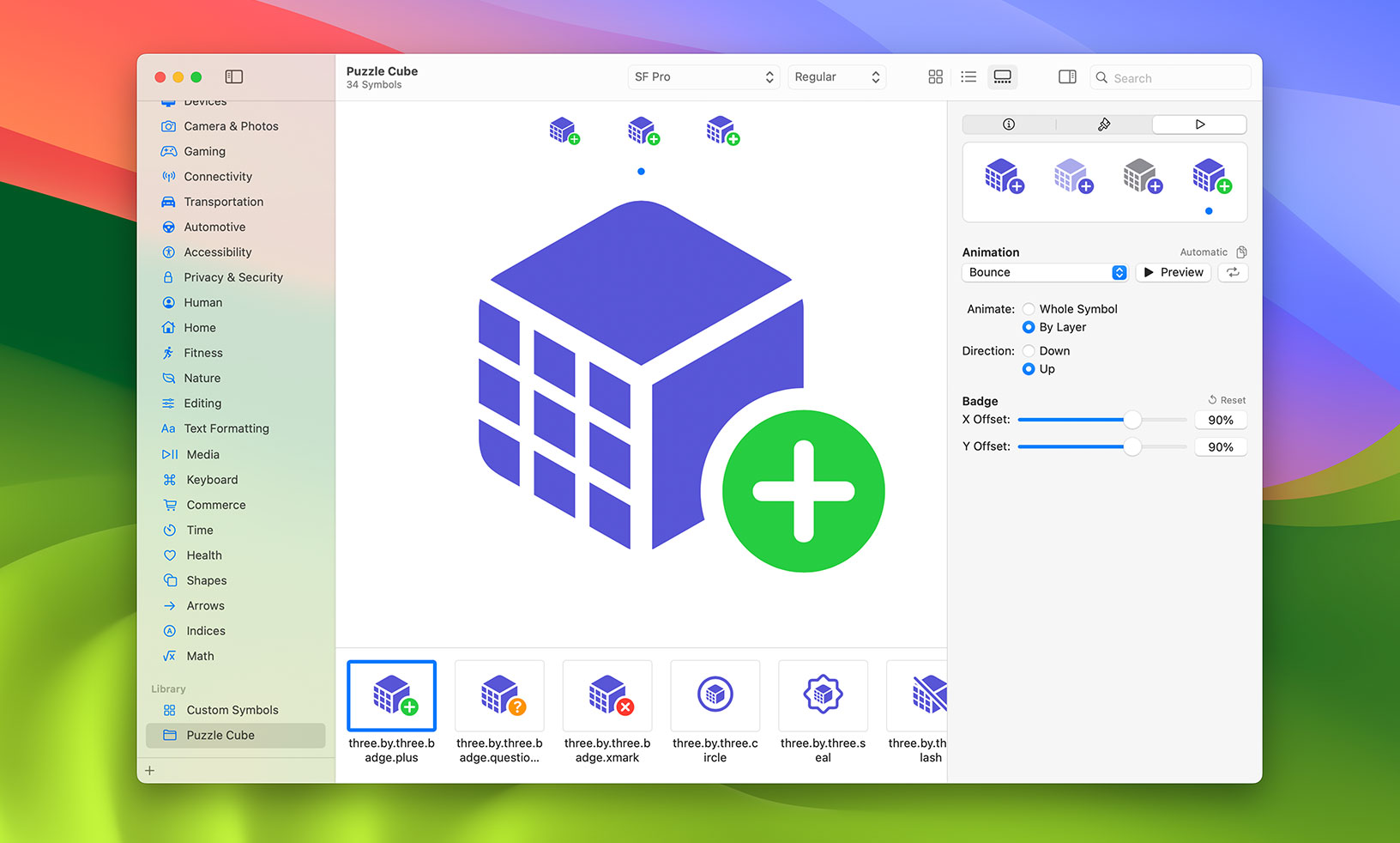 SF Symbols 5 include simboli che è possibile sfruttare per animazioni nelle app con effetti quali rimbalzi, ridimensionamento e impulsi, movimenti che appaiono secondo il layer selezionato. Apple spiega che gli effetti animati permettono di “portare vitalità alle interfacce e fornire feedback all’input utente per comunicare cambiamenti di stato nell’attività in corso”.