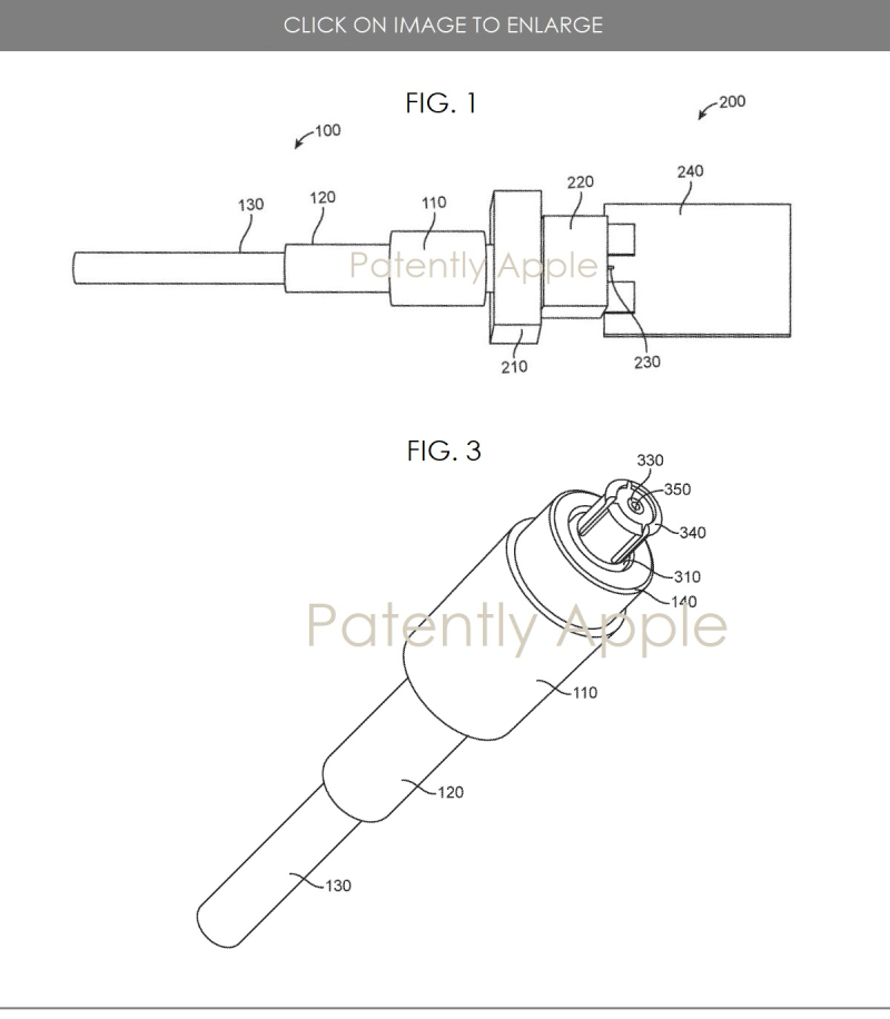 Dal brevetto riferisce il sito PatentlyApple, evidenziando connettori di nuova generazione con inserzioni e bocchettoni che non hanno bisogno di incastri per garantire un collegamento stabile e uniforme.