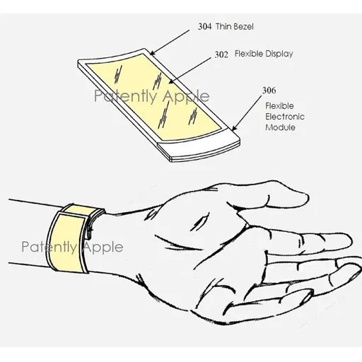 Nel brevetto di Apple si mostrano prototipi di display flessibili, evidenziando che gli strati di questi possono essere composti da vari materiali (vetro, plastica e altro). In una delle figure, in particolare, si nota un display indossato intorno al polso, come un braccialetto: un riferimento non troppo velato all’iWatch?