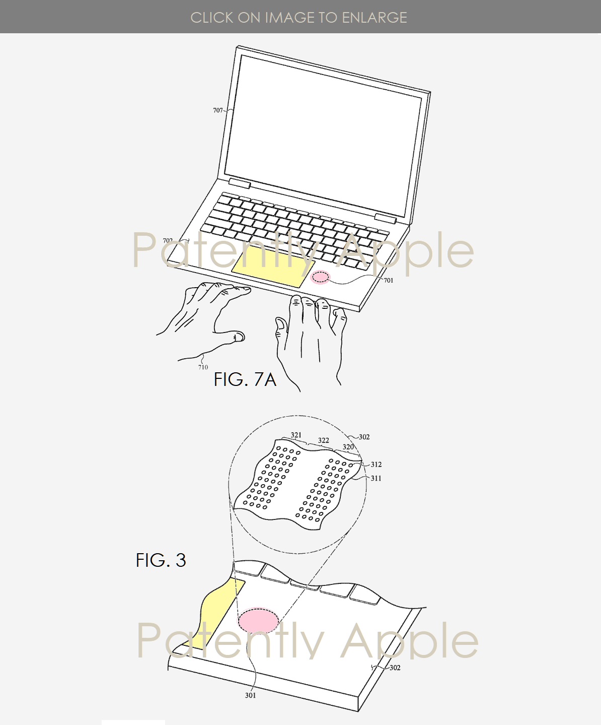 Il brevetto scovato dal sito PatentlyApple e legato alla percezione corporea prevede l’uso di strati traslucidi e opachi sulla superfice superiore del computer con micro-fori che trasmettono luce o altra anergia ottica nella zona laterale destra dove è presente il trackpad.