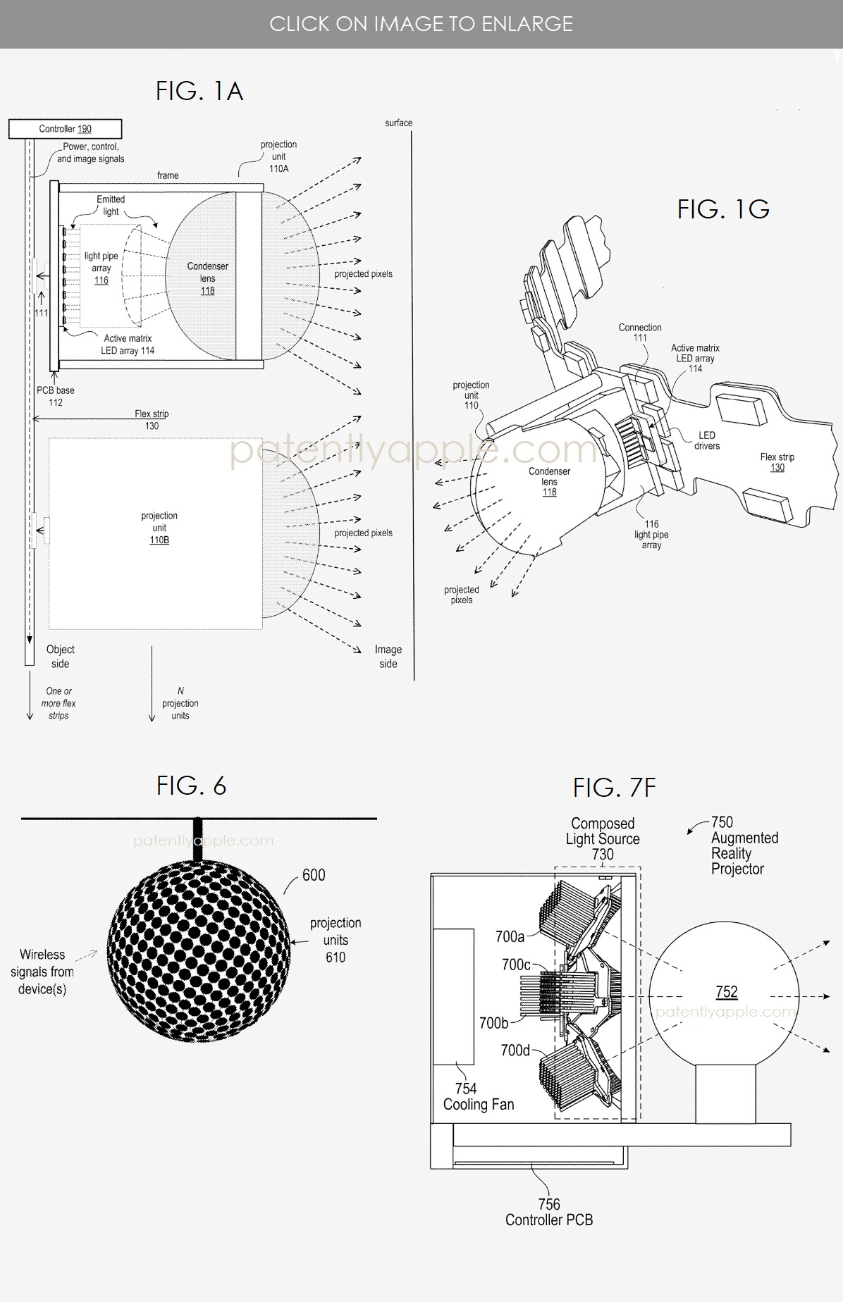 Apple spiega che “due o più unità possono essere collegate ad una striscia flessibile per l’alimentazione e la trasmissione dei dati […] verso unità di proiezione, un emettitore di luce o verso un sistema di proiezione a forma di lampada”, evidenziando tutta una serie di possibili configurazioni e forme, mostrando quelli che sembrano a tutti gli effetti avanzati sistemi di proiezione per realtà aumentata e mista.