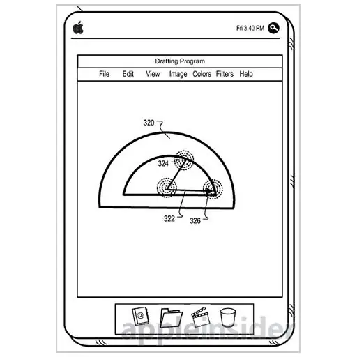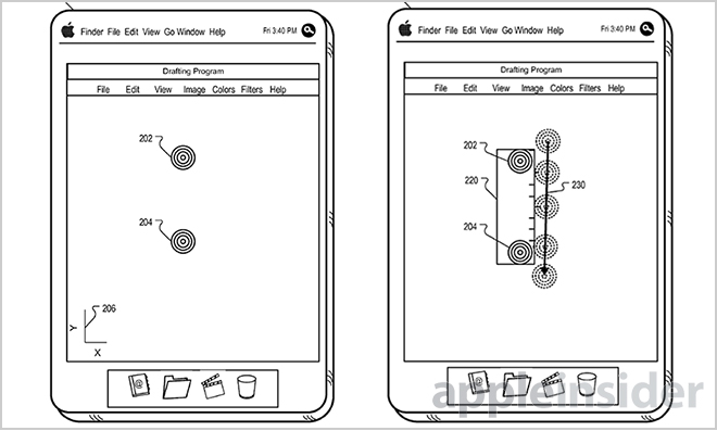 Nel brevetto numero 8,487,889, scovato da Appleinsider e intitolato “Virtual drafting tools”, si indicano i dettagli di un’interfaccia per CAD e progettazione, con strumenti su schermo manipolabili in vari modi sfruttando un display multitouch. Nella concessione è spiegato che gli odierni CAD e altre applicazioni di progettazione che lavorano in due o tre dimensioni, richiedono l’attivazione di strumenti poco intuitivi all’interno di spazi di lavoro virtuali. Per disegnare ad esempio una linea diritta, l’utente deve spostarsi dall’area di disegno, accedere a un menu laterale, selezionare lo strumento per il disegno di linee, tornare allo spazio di lavoro e specificare punto iniziale e punto finale della retta. Su un display multiotuch questi passaggi possono essere semplificati, dice Apple. Nel brevetto è spiegato come tenere conto di due punti contemporaneamente, gestendo i due eventi, e sfruttare la lettura della posizione per visualizzare un righello virtuale. Lo strumento richiamabile dall’utente può essere visualizzato per pochi istanti o fino a quando non si è terminato; con lo strumento attivo, è possibile ridimensionare, scalare oggetti e attivare altre azioni con le gesture.