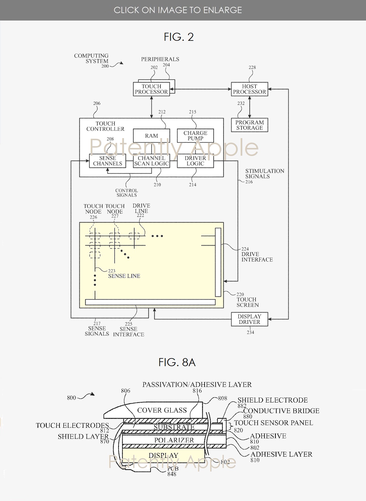 In alcuni esempi indicati nel brevetto si mostra la possibilità di ridurre lo spessore del touch screen e della regione ai bordi rimuovendo la connessione del circuito stampato flex dai vari strati che compongono il display. Un substrato flessibile può essere sfruttato per permettere l’instradamento degli elettrodi a contatto alla circuiteria touch. In alcuni esempi il meccanismo di strati impilati per il touch screen prevede uno strato protettivo tra il pannello con il sensore touch e il display.