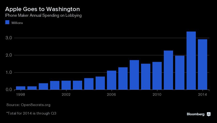 Citando alcune statistiche sulle spese per le attività di lobbying tracciate dal sito OpenSecrets.org, Bloomberg spiega che Apple ha incrementato la sua azione negli ambienti amministrativi di Washington, città dove hanno sede le principali istituzioni governative degli Stati Uniti. Il nuovo servizio per i pagamenti mobili Apple Pay e il trattamento dei dati biometrici con Apple Watch, si aggiungono a una lista di prodotti e servizi che spaziano dalle telecomunicazioni al cloud computing, e che richiedono il supporto delle istituzioni governative.