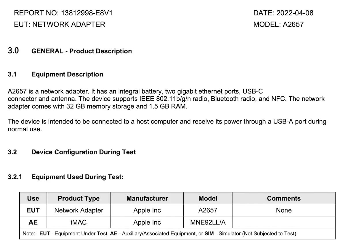 Dagli archivi della Federal Communications Commission (FCC) – l’agenzia governativa statunitense che gestisce le telecomunicazioni – emerge la registrazione di un dispositivo al quale Apple fa rifimento con il nome in codice “A2657” indicato come un generico “adattatore di rete”.