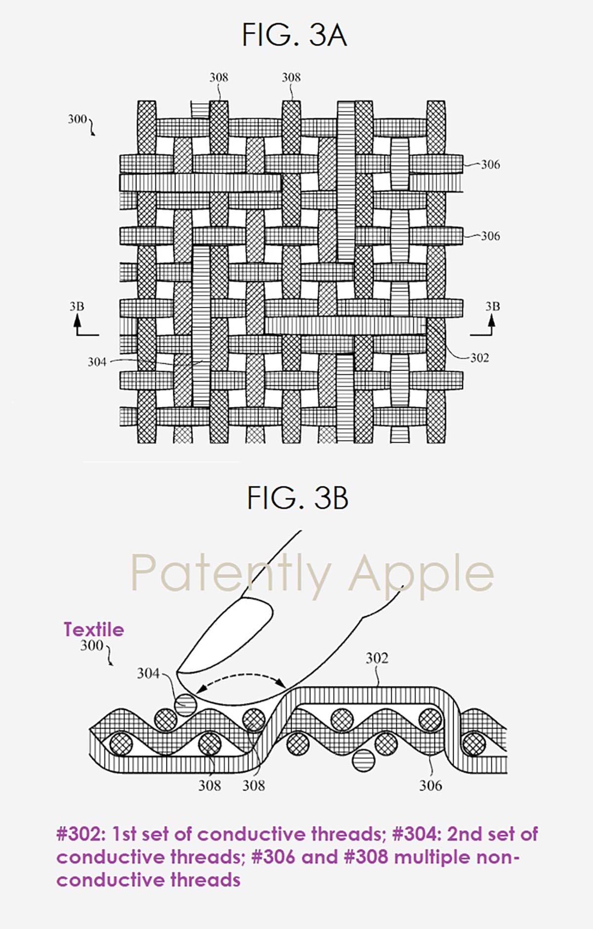 Tra le peculiarità dell’ultimo brevetto di Apple, la possibilità di integrare nel tessuto componenti e circuiti elettronici in grado di riconoscere tocchi e gesture sulla superficie del tessuto. Apple evidenzia esplicitamente la possibilità di riconoscere “perlustrazioni” e movimenti del dito sulla superficie del tessuto che possono essere interpretate come comandi o altri input. È possibile configurare un dispositivo con un tessuto del genere in modo da riconoscere forza e tocco, eseguendo comandi specifici. Apple ha previsto la possibilità di stimare la posizione del tocco su una superfice di questo tipo sfruttando due serie di filati conduttivi orientati trasversalmente tra loro all’interno del materiale tessile, indicando possibili usi in custodie, sacche, zaini, ecc.