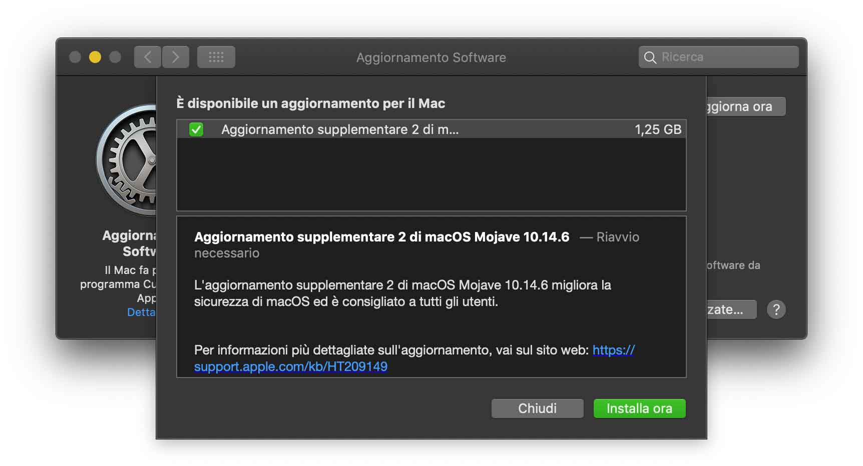 Per installare l’update basta selezionare “Aggiornamento Software” dalle Preferenze di Sistema, e fare click su “Aggiorna ora” per installare gli update proposti.