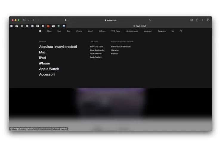 Nella versione desktop del sito, i menu drop-down appaiono quando si sposta il mouse sulle categorie proposte in alto (Store, Mac, iPad, iPhone, Watch, AirPods, TV&Casa, Intrattenimento, Accessori, Supporto, ecc.). La nuova voce “Intrattenimento” nelle categorie in alto prende il posto di “Solo con Apple” ed evidenzia i servizi (Apple One, Apple TV+. Apple Music, Apple Arcade, Apple Fitness+, Apple Podcast, Apple Books, App Store).
