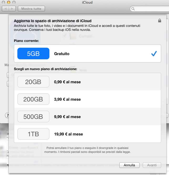 Per acquistare lo spazio aggiunto da OS X basta portarsi nelle Preferenze di Sistema, selezionare iCloud, fare click su “Gestici” per visualizzare il piano corrente, fare click su “Acquista più spazio” e scegliere il nuovo piano di archiviazione.