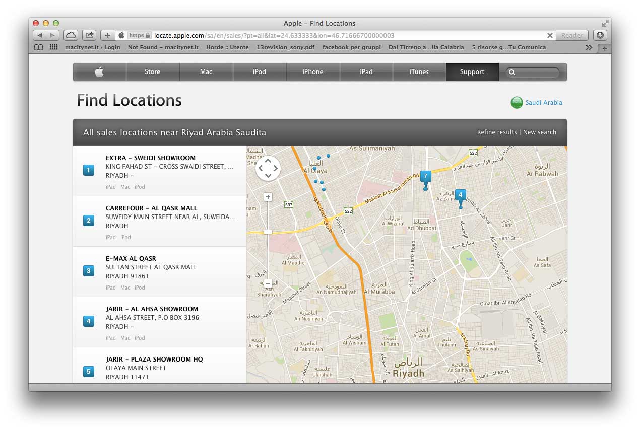 Gli iPhone 5c e 5s nel grande Stato arabo dell’Asia occidentale erano arrivati un mese e mezzo dopo la commercializzazione nel resto del mondo. Apple non sembra avere al momento un suo store online: i clienti sono indirizzati a rivenditori autorizzati di Riyad, Gedda, La Mecca e altre ancora.
