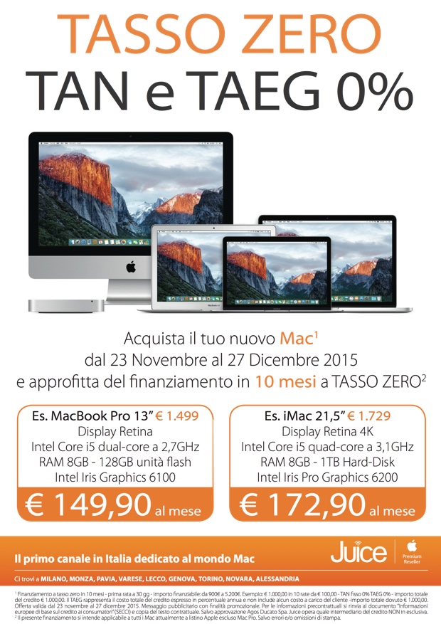 Grazie al finanziamento Tasso Zero di Juice, con TAN e TAEG pari a zero, è possibile acquistare qualsiasi Mac a listino, con l’unica eccezione di Mac Pro, suddividendo la spesa totale in 10 mesi. Per esempio comprando MacBook Pro 13” da 1.499 euro si pagano 10 rate da 149,90 euro, invece per iMac 21,5 Retina 4K da 1.729 euro si pagano 10 rate da 172,90 euro. Questa promozione non prevede alcuna spesa di pratica e nemmeno interessi per il clienti ed è valida fino al 27 dicembre.