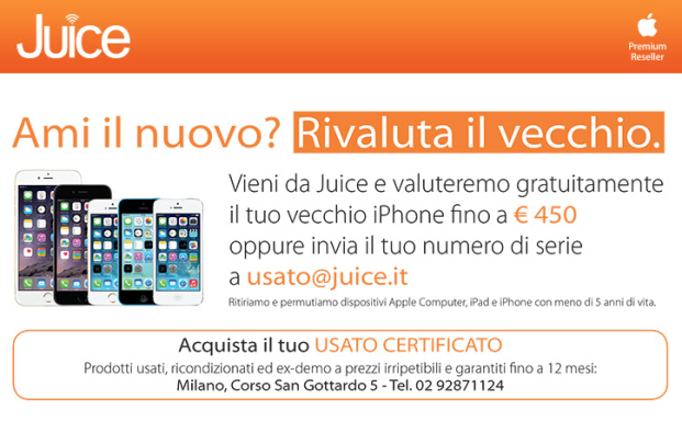 Infine ricordiamo che Juice offre il servizio di valutazione gratuita e ritiro di iPhone, iPad e Mac usati. Per ottenere la valutazione del proprio computer o dispositivo mobile Apple usato basta visitare un negozio Juice oppure scrivere una mail con il numero di serie a [email protected].