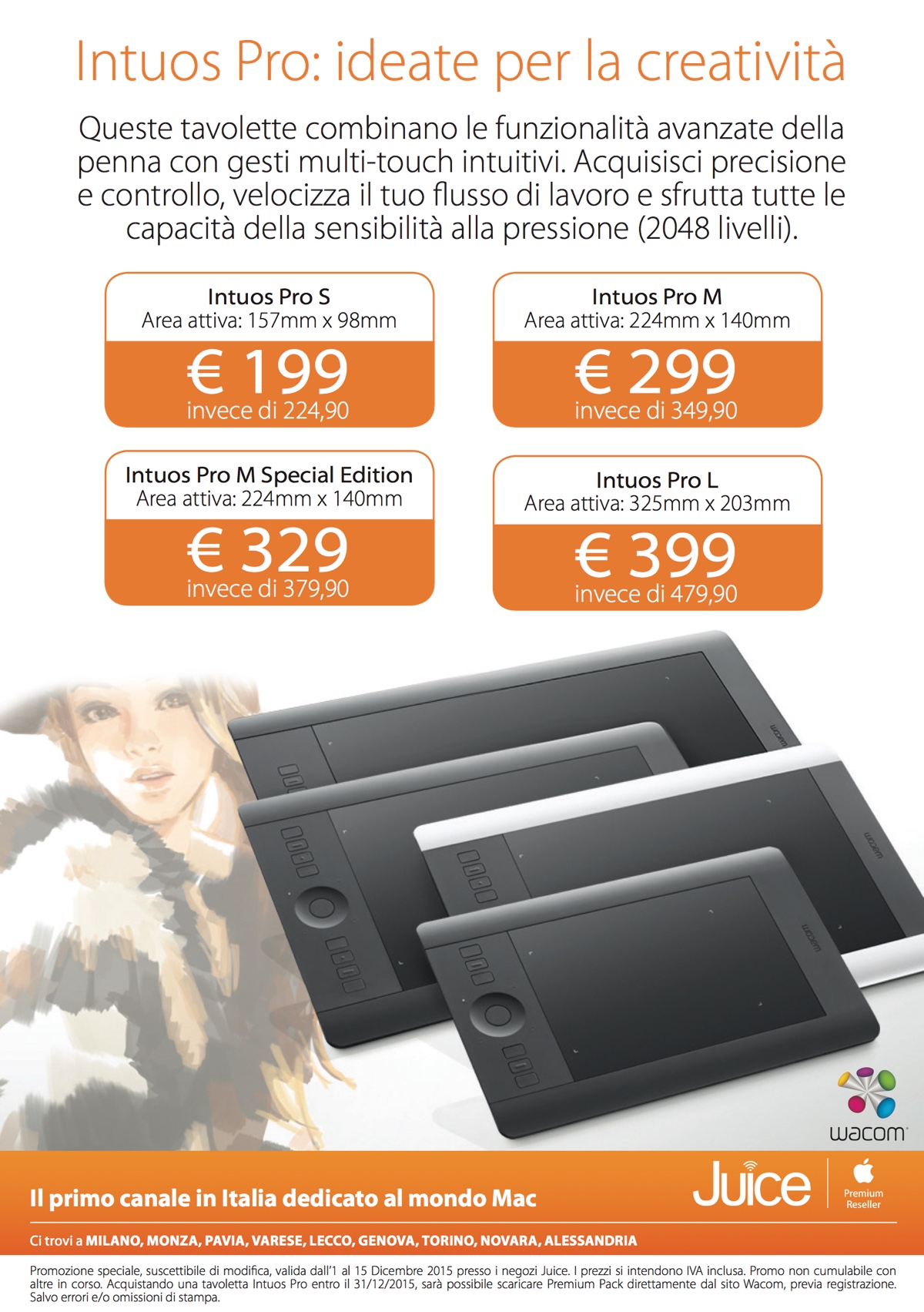 Solo nei punti vendita della catena Juice è possibile acquistare a prezzo scontato le tavolette grafiche Wacom. Apprezzate non solo da grafici e professionisti ma anche da appassionati di disegno e fotoritocco, offrono controlli multi touch intuitivi e la possibilità di scrivere, disegnare e colorare sfruttando il rilevamento di ben 2.048 livelli di pressione, simulando così fedelmente matite e colori reali.