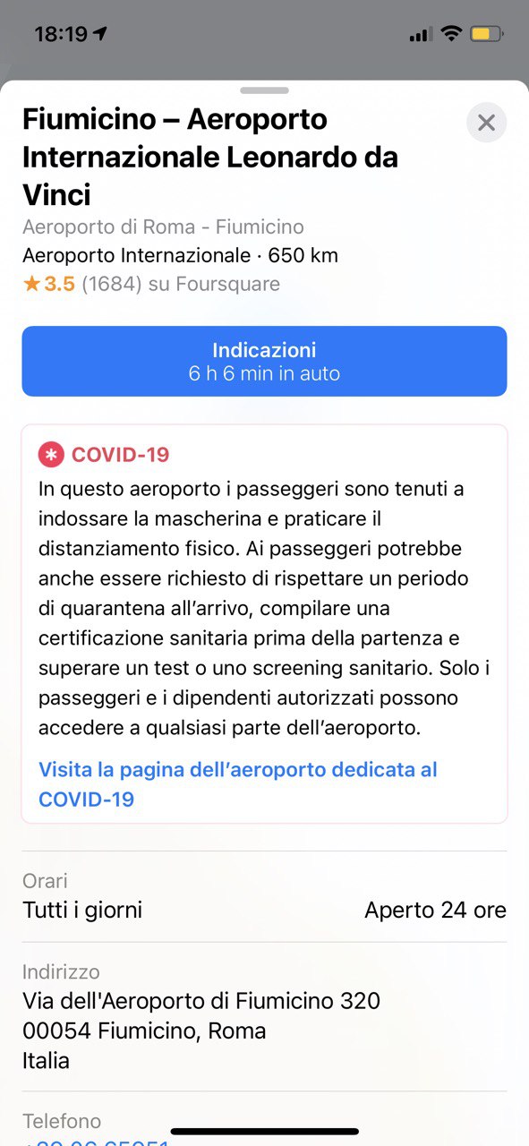 Per i passeggeri, ACI aggiunge che informazioni più dettagliate possono essere trovate anche sulla sua app mobile Check & Fly e sul suo portale passeggeri dedicato. Nel momento in cui scriviamo l’app Apple Mappe mostra al volo le informazioni sanitarie anti Covid per i principali aeroporti in Italia, Roma Fiumicino incluso, ma non per esempio per Milano Malpensa o Milano Linate. In ogni caso è probabile che la copertura degli scali venga ampliata nei prossimi giorni.