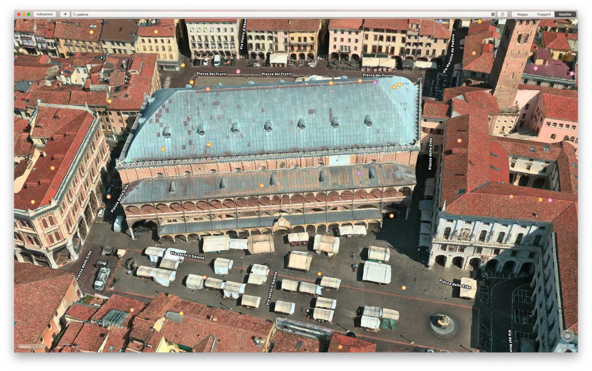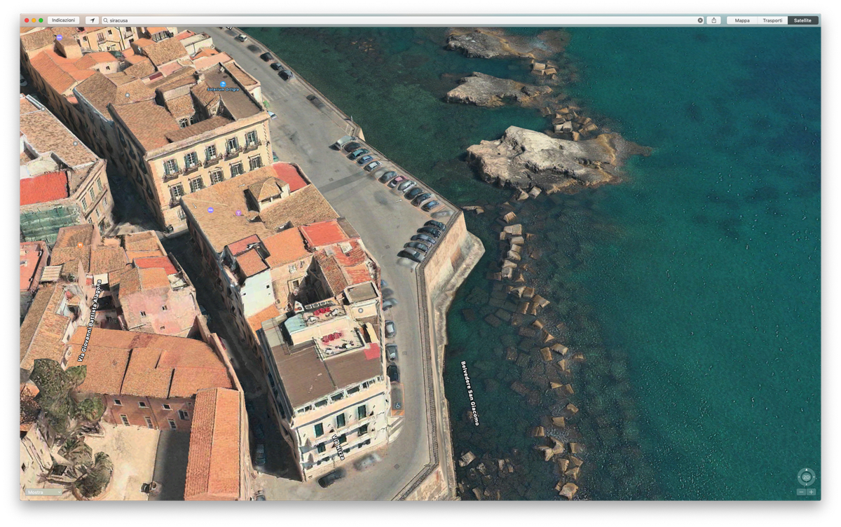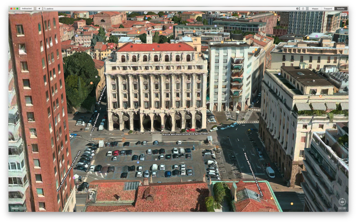 Apple Mappe mostra Padova, Reggio Calabria e Siracusa con vista Flyover 3DIl livello di zoom e dei dettagli in Flyover 3D è impressionante. Nelle zone coperte è possibile distinguere dettagli piccolissimi, come per esempio i panni stesi su finestre e balconi. Intervenendo sulla bussola nell’angolo in basso a destra in Apple Mappe su Mac è possibile ruotare e inclinare la visuale a piacere. In questo modo è possibile effettuare veri e propri tour virtuali ammirando monumenti, palazzi ed edifici storici, seguire il lungomare di Reggio Calabria, Siracusa e delle altre località italiane dove Flyover è disponibile.