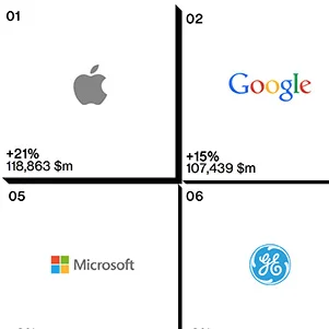 Dando uno sguardo agli inseguitori, proprio dietro Apple, con una stima di 107,4 miliardi dollari, si piazza Google; il colosso di Mountain View, nel 2014 ha spodestato un brand importante come Coca-Cola. Anche Google è in crescita rispetto allo scorso anno, del ben 15%,  mentre completano la top five Coca-Cola, IBM e Microsoft, con rispettive valutazioni pari a 81,6 miliardi, 72,2 miliardi e 61,2 miliardi di dollari. Il rivale principale di Apple in campo smartphone e tablet, invero Samsung,  si piazza soltanto al settimo posto, avanti di una posizione rispetto all’anno precedente.