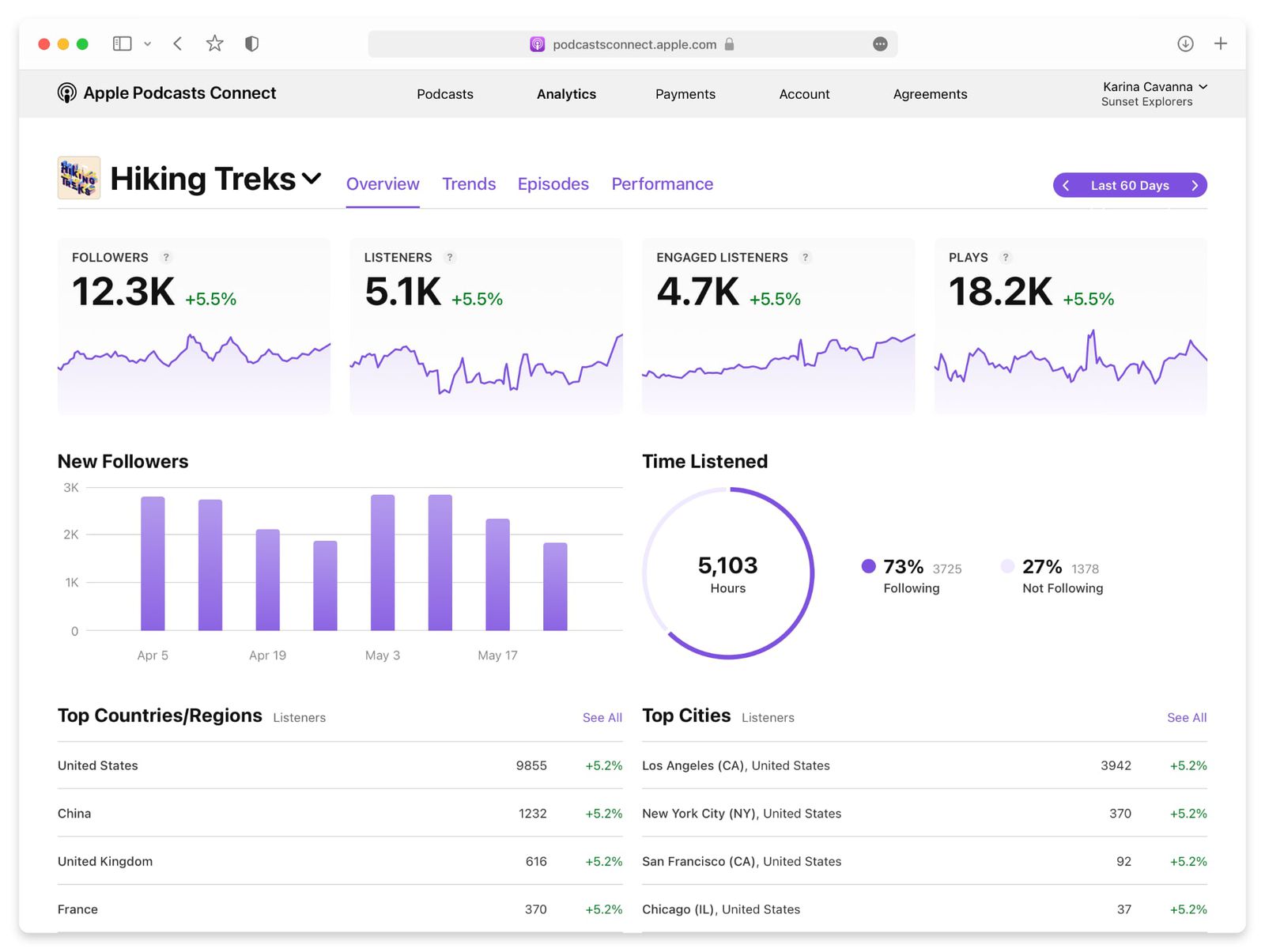 Nella scheda Analytics in Apple Podcasts Connect, i creatori saranno in grado di visualizzare i follower suddivisi per spettacolo e tenere traccia dei follower tra i vari contenuti pubblicati. L’interfaccia mostrerà nuovi follower guadagnati nell’ultima settimana, mese, 60 giorni e da sempre, inoltre elencherà metriche come il tempo di ascolto.