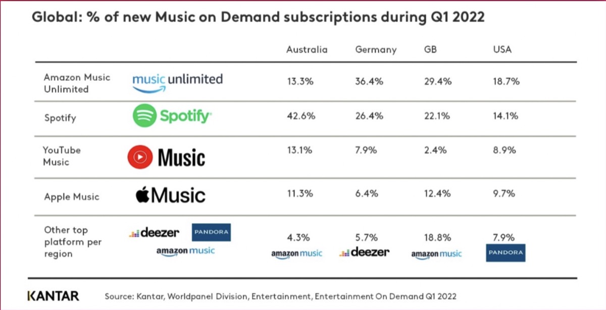 Oltre 1 milione di abbonamenti sono stati annullati nell’ultimo trimestre: di questi il 37% per motivi economici. Questo numero è aumentato rispetto al 4% rispetto allo stesso periodo dell’anno scorso. Secondo il sondaggio, Apple Music ha avuto il 12,4% di nuovi abbonati nel Regno Unito nell’ultimo trimestre, seguito dall’ 11,3% in Australia, 6,4% in Germania e 9,7% negli Stati Uniti.