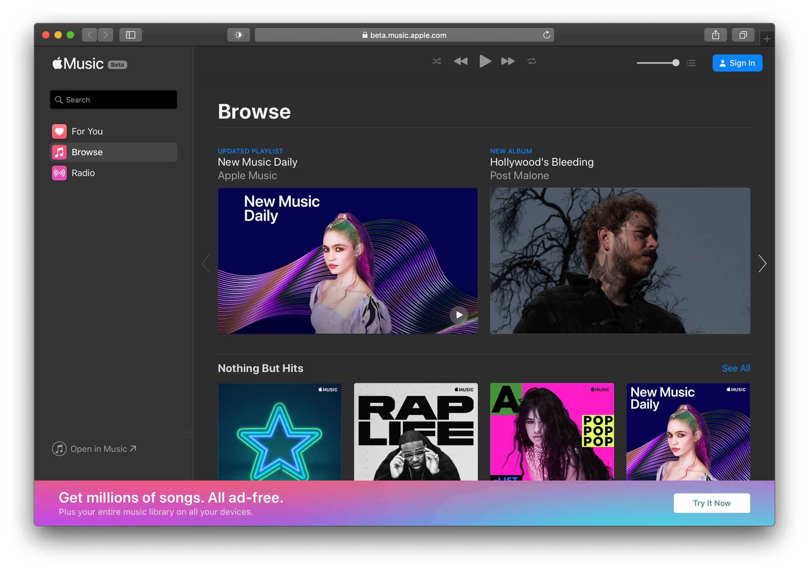 Apple ha lanciato la versione beta di Apple Music per il web. Il sito web in questione offre funzionalità simili alla nuova app Apple Music su macOS Catalina permettendo di scoprire e comprare musica tra oltre 50 milioni di brani, playlist e video musicali dalle sezioni “For You” “Browse” e “Radio”.