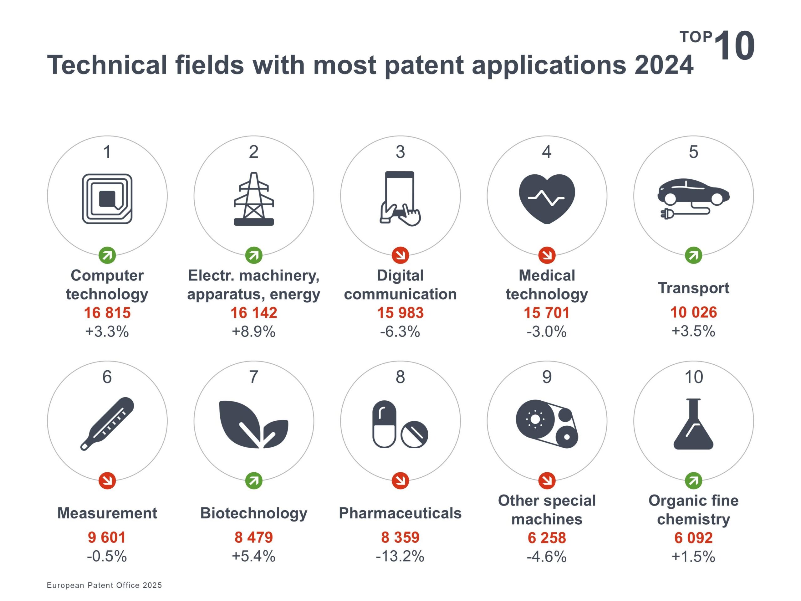 Tecnologie informatiche che riguardano aree quali: AI, machine learning e riconoscimento di pattern, sono diventate per la prima volta i settori principali di domanda, con 16.815 richieste di brevetti nel 2024; tecnologie legate a macchinari elettrici, apparati ed energia registrano una forte crescita (+8,9% rispetto al 2023) trascinate da progressi nelle tecnologie energetiche più pulite e innovazioni nelle batterie (+24%). Si segnala invece un calo nei brevetti che riguardano le comunicazioni digitali (-6,3%).
