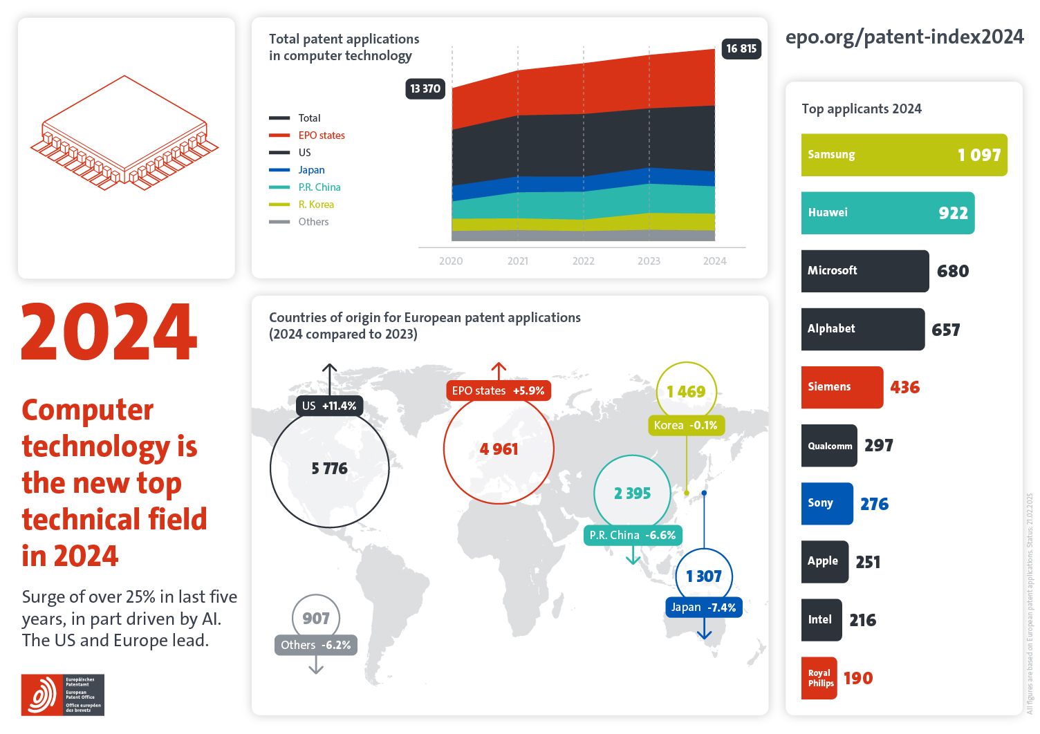 Di tutti i richiedenti a livello globale, sei su 20 delle attività commerciali che hanno fatto richiesta all’EPO hanno sede negli Stati Uniti e includono aziende quali Qualcomm (con 3015 domande di brevetto, e 4a a livello globale), l’azienda RTX che opera nel settore aerospaziale e della difesa (2061 richieste), Alphabet (1171), Microsoft (1131), InterDigital (863) e Apple (806). Nel campo tecnologico il principale brand che ha presentato domande di brevetti in Europa è Samsung.