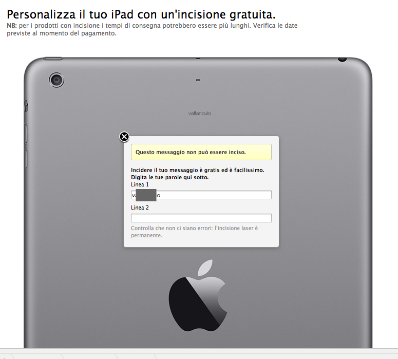 Se volete provare direttamente lo spirito educativo che sprigiona dalle politiche di incisione al laser Apple, basta scegliere questo tipo di personalizzazione all’atto dell’ordine di un iPad o un iPod touch, un iPod shuffle o un iPod classic, e fare qualche prova utilizzando parole che probabilmente la maggior parte delle persone non utilizzerebbe per una dedica personalizzata per un prodotto Apple.