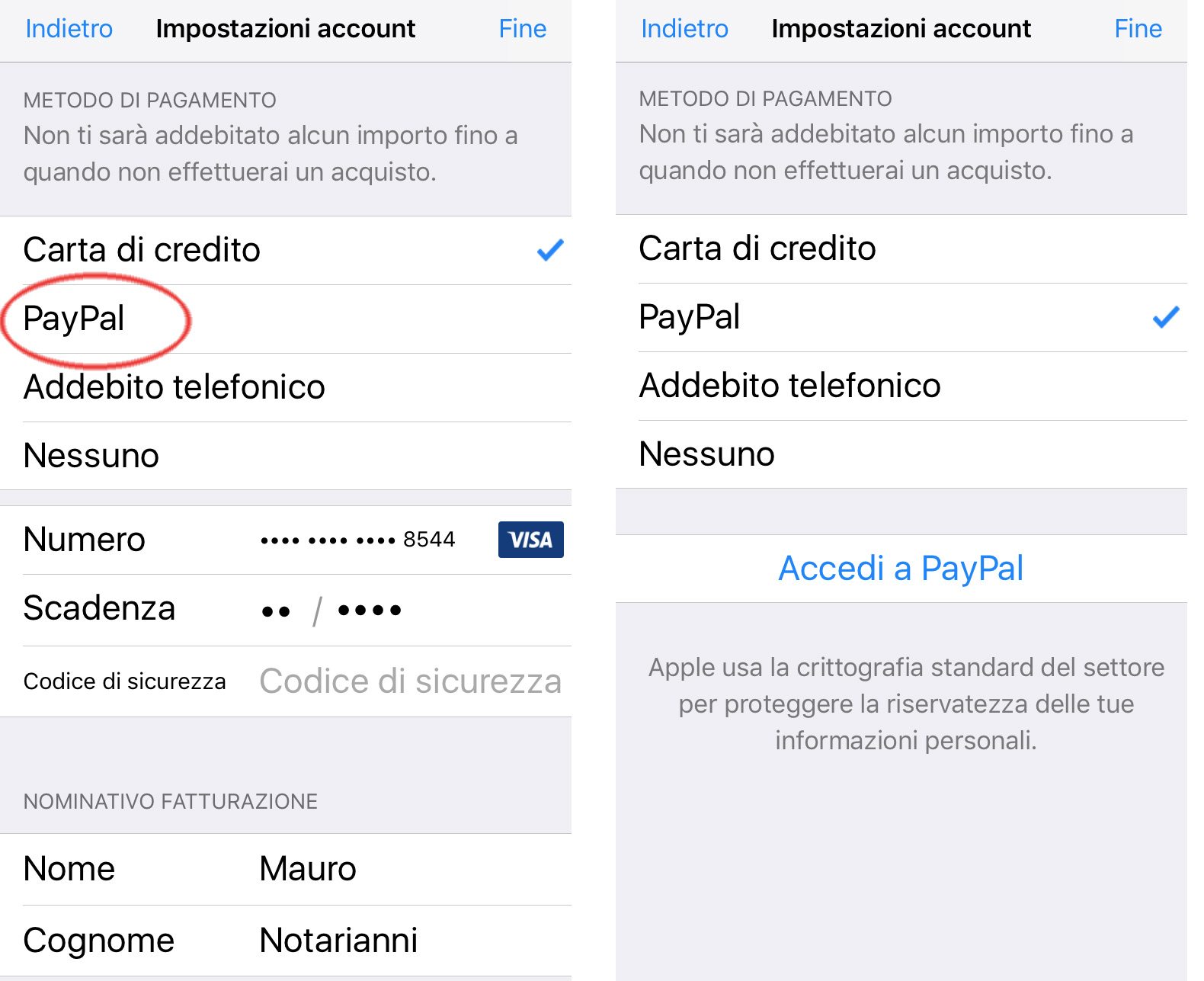 In alternativa al web, è possibile impostare il metodo di pagamento con PayPal direttamente dal dispositivo iOS (iPad o iPhone). Basta andare in Impostazioni, selezionare “iTunes Store e App Store”, scegliere Visualizza ID Apple, selezionare “Info su pagamento”, scegliere “PayPal”, accedere a PayPal e confermarlo come metodo di pagamento per gli acquisti su iTunes e App Store.
