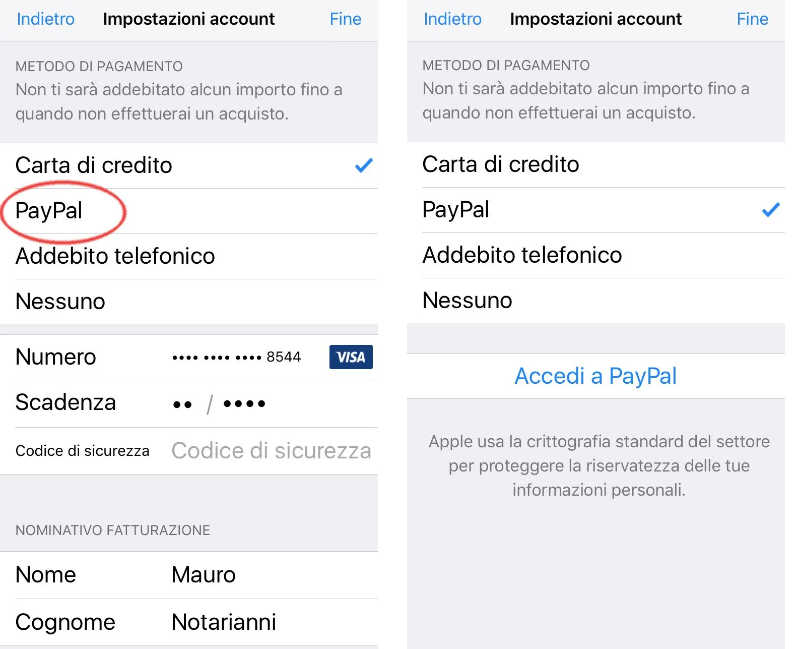 Dopo avere scelto PayPal, questo metodo sarà sfruttato da quel momento in poi come default. I metodi di pagamento disponibili variano in base al Paese e all’area geografica. Generalmente sono disponibili i seguenti metodi: Carte di credito, Carte di debito, Credito dello store (es. carte regalo iTunes o Apple music), PayPal (richiede una carta di credito come metodo di pagamento collegato all’account), fatturazione con telefono cellulare e altri metodi ancora.