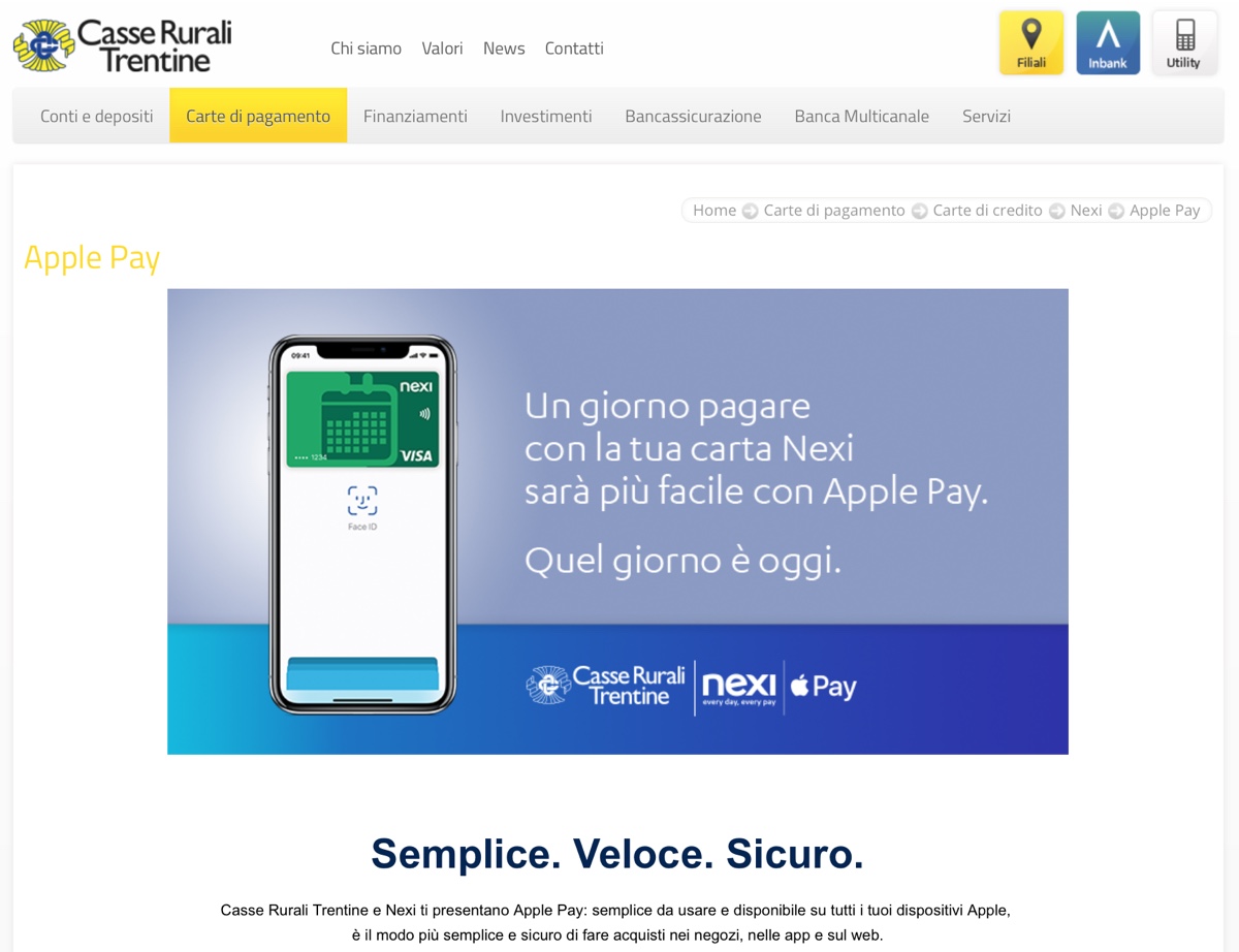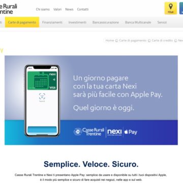 Il supporto di Apple Pay in Italia è evidenziato in tutti i siti web degli istituti bancari supportati, inclusi quelli appena aggiunti. Nelle immagini promozionali capeggia iPhone X mentre sullo schermo è riportata l’immagine della carta di credito con i colori e il logo dell’istituto in questione. La pagina di presentazione del supporto Apple Pay evidenzia la facilità di configurazione e di utilizzo del sistema oltre alla sicurezza della piattaforma.