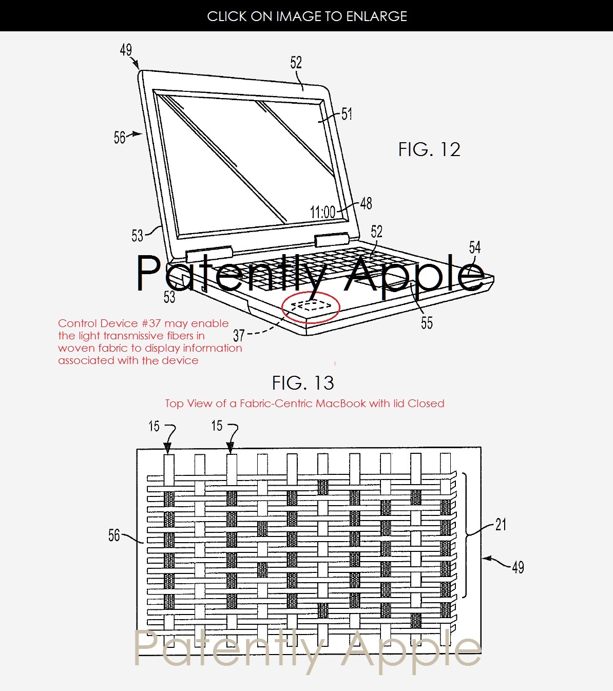 Apple, nel brevetto scovato dal sito PatentlyApple, parla di materiali “intelligenti” che possono essere integrati sui portatili nella zona dove si appoggiano i palmi delle mani (vicino al trackpad) e potrebbero essere attivati per mostrare messaggi di stato sul MacBook e altre informazioni. In un diverso esempio si descrive un finto tessuto che sembra scamosciato, un elemento che potrebbe portare ad un cambiamento di rotta radicale rispetto all’alluminio visto finora.