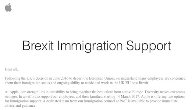 Non è solo negli USA che Apple si trova a dover affrontare nuove regole per il personale che arriva dall’estero e che complicano la vita dell’azienda, ma fonte di preoccupazione è anche l’uscita della Gran Bretagna dall’Unione Europea, la cosiddetta Brexit, con conseguenze così ampie da non poter ancora determinare con certezza quello che accadrà.