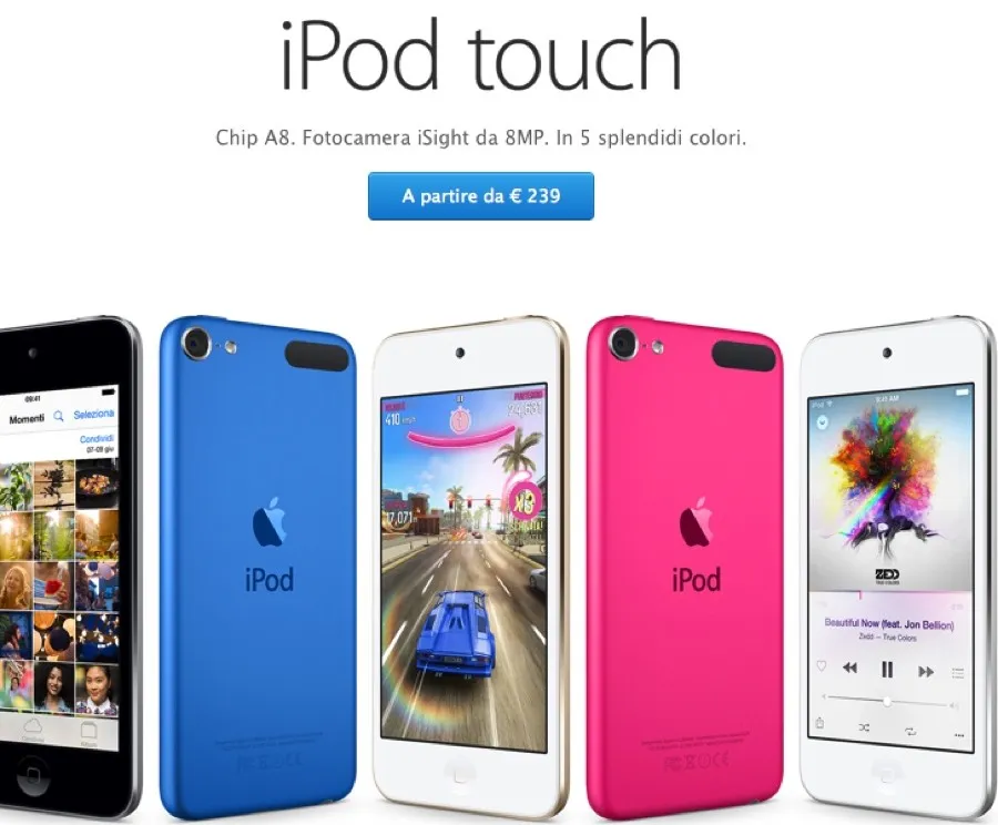 Il nuovo iPod touch parte da €239 (IVA e oneri di legge incl.) per il modello da 16 GB, 289 euro (IVA e oneri di legge incl.) per il 32 GB e €349 (IVA e oneri di legge incl.) per il 64GB, e l’intera famiglia iPod nei suoi cinque nuovi colori è disponibile a partire da oggi attraverso l’Apple Store Online, i negozi retail Apple e alcuni Rivenditori Autorizzati Apple. Per la prima volta, iPod touch è disponibile in un modello da 128 GB per 469 euro (IVA e oneri di legge incl.) attraverso Apple Store e su Apple Online Store, insieme alla linea (PRODUCT) RED. iPod touch richiede una connessione Wi-Fi o un Mac o un PC; una porta USB 2.0; Mac OS X v10.7.5 o successivo; Windows 7, Windows 8 o successivo; e iTunes 12.2 o successivo. È necessario un ID Apple per alcune funzioni di iPod touch.