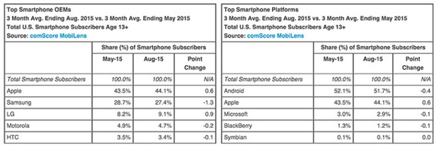 Grazie alle buone vendite di iPhone 6 la quota di Apple negli smartphone in USA passa dal 43,5% del trimestre precedente al 44,1% con una crescita dello 0,6%. Nello stesso periodo cala invece sensibilmente la quota di Samsung che perde l’1,3%, la perdita più consistente tra i primi 5 in classifica. Al terzo posto troviamo LG che passa dall’8,2% al 9,1% registrando così l’incremento più consistente nei Top 5 pari al 0,9%. Diminuiscono anche Motorola dello 0,2% e HTC con -0,1%. Nei dati di comScore relativi alle piattaforme smartphone, riportati da AppleInsider, andrid domina con il 51,7% in calo dello 0,4%, seguito da Apple con il 44,1% in aumento dello 0,6%, mentre Microsoft è terza con il 2,9%, seguita da Blackberry con l’1,2% infine da Simbyan ormai prossima allo zero assoluto. Con l’arrivo dei nuovi iPhone 6s si prevede che vendite e statistiche in USA saranno ancora favorevoli per Apple nel trimestre in corso.