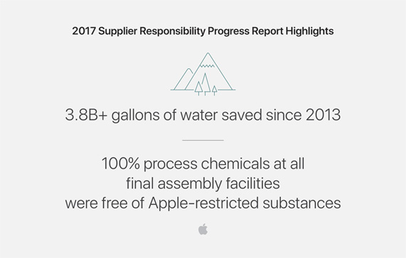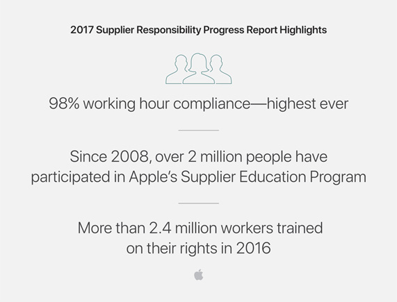 Nel report 2017, quindi su dati e ispezioni effettuati nel 2016, si evidenziano importanti progressi relativi all’osservanza delle ore di lavoro, evidenziando il successo del Supplier Education Program, programma pensato affinché chi lavora nella filiera venga trattato in modo giusto ed equo. Apple è da tempo impegnata per eliminare e i casi di lavoro vincolato o minorile e gli orari eccessivamente prolungati, verificando inoltre che le materie prime vengano ottenute in modo sostenibile.