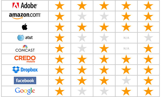 L’organizzazione valuta vari big del settore tenendo conto di vari parametri: le buone pratiche accettate dall’industria di settore, comunicazioni agli utenti di dati richiesti da enti governativi, adozione di specifici principi sulla gestione dei dati, il pubblico rendere noto di richieste di rimozione dati da parte di governi, l’opporsi alle backdoor. Altre società che hanno ottenuto eccellenti punteggi, sono: Adobe, Credo Mobile, Dropbox, Sonic, Wikimedia, WordPress, Wickr e Yahoo, a tutte le quali sono state assegnate le cinque stelle.