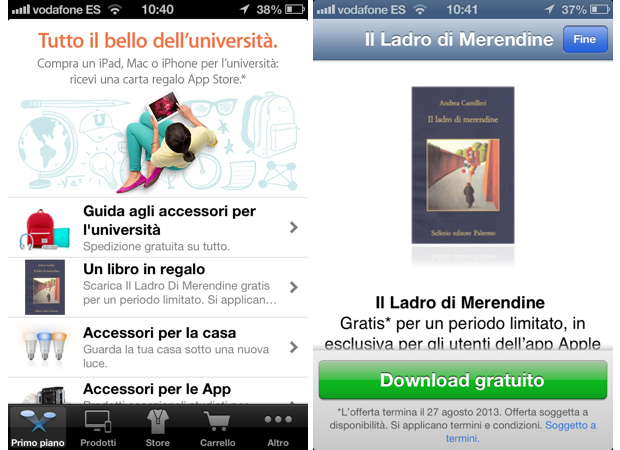 Ricordiamo che le promozioni e i regali all’interno dell’app Apple Store hanno una durata limitata nel tempo: gli utenti interessati farebbero bene a scaricarla appena possibile. L’ebook Il Ladro di Merendine di Andrea Camilleri sarà disponibile come download gratuito fino al 27 agosto, dopo questa data è molto probabile che apple offrirà un altro contenuto in regalo tra app, giochi, ebook o musica.
