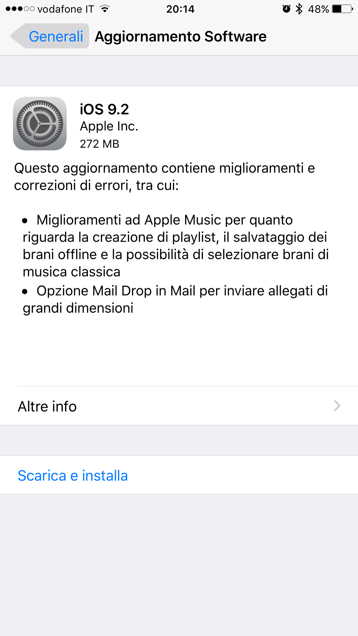 Dopo un periodo non troppo lungo di beta testing, Apple ha rilasciato, con OS X 10.11.2, WatchOs 2.1 e tvOS 2.1, iOS 9.2. La lista di novità è piuttosto lunga, anche se nessuna appare essenziale e un gran parte si tratta di bug fix. Le principali, da appuntarsi, sono una serie di miglioramenti di Apple Music, Mail Drop per mandare allegati di grandi dimensioni senza spedirli direttamente, supporto 3D Touch per iBooks e il supporto di iPhone per gli adattatori che consentono di collegare dispositivi USB a connettore Lighting