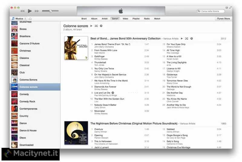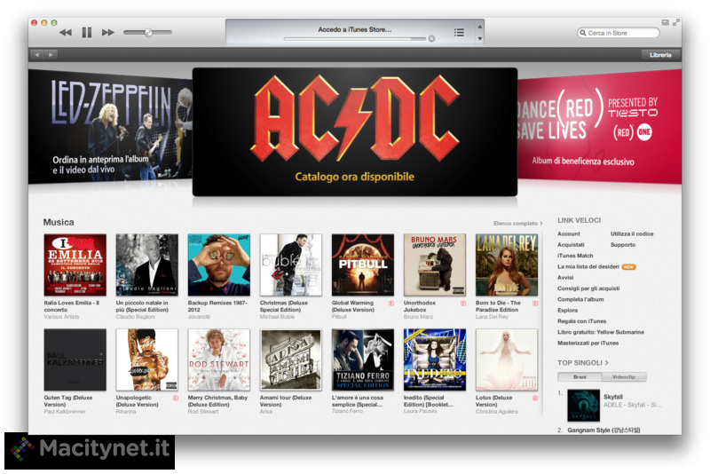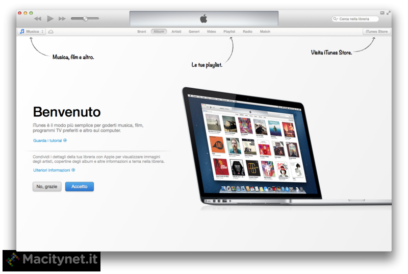iTunes migliora la struttura di ricerca e l’ascolto della musica, l’accesso ai film e ai programmi TV preferiti (ove disponibili). A disposizione ci sono motivi personalizzati per ogni album, film o programma TV presente nella tua libreria e si ha la possibilità di ottenere consigli basati sui propri gusti. iTunes Store è stato completamente ridisegnato, musica, i film, i programmi TV acquistati in iCloud vengono ora mostrati nella tua libreria ed è possibile scaricane una copia da sincronizzare su un dispositivo o da riprodurre mentre non si è in linea.