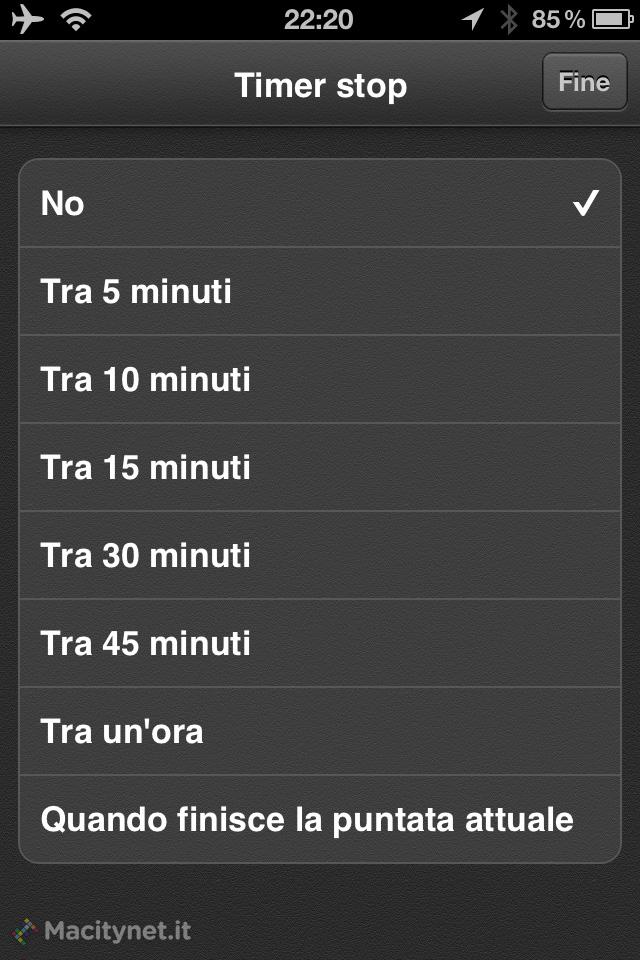 Dalla parte di riproduzione possiamo anche attivare una sorta di sleep che ci permette di decidere di far spegnere automaticamente l’iPhone, l’iPad o l’iPod touch dopo un periodo predeterminato oppure al termine della puntata del Podcast stesso. Utile se ad esempio preferiamo ascoltare un Podcast mentre ci addormentiamo