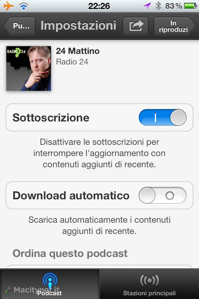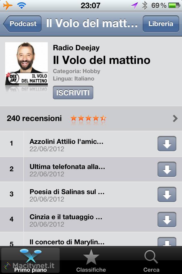 L’abbonamento ad un Podcast è piuttosto semplice, anche se opera diversamente per i Podcast principali (quelli proposti nell’interfaccia della libreria) da quelli che sono in iTunes. Nel primo caso dovremo toccare la piccola “i” che troviamo a destra, accanto all’icona del Podcast. Nel secondo caso dovremo entrare nel catalogo e toccare Iscriviti.