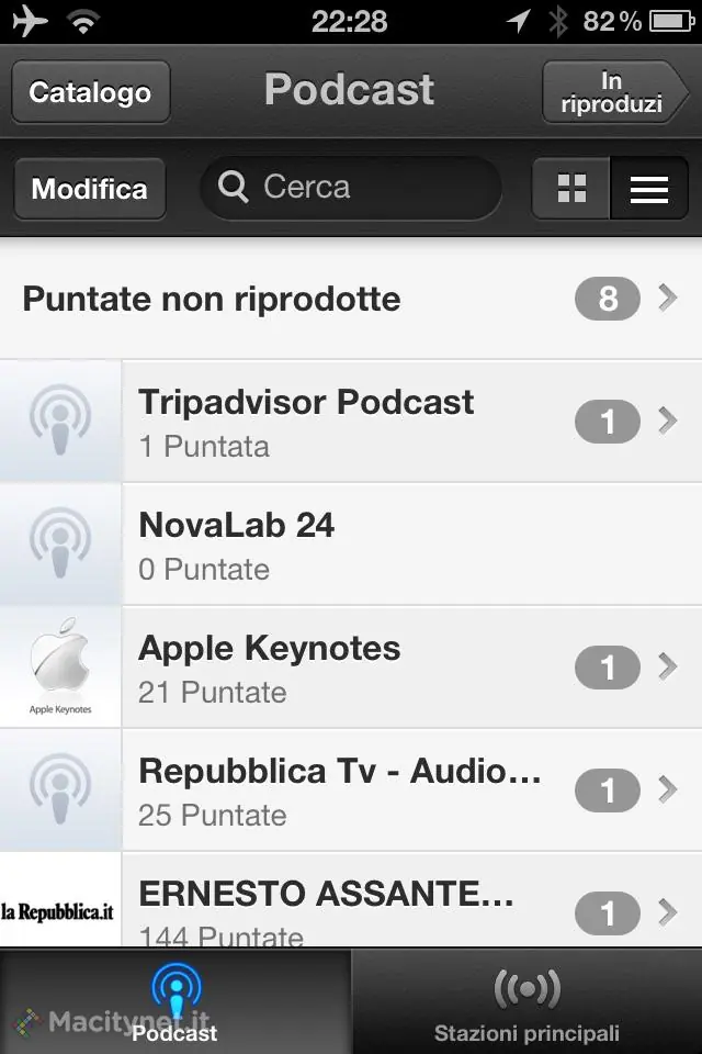 La visione della libreria dei nostri Podcast può essere, come per la musica di iPod, ad icone (con l’immagine del Podcast) oppure a lista. In questo secondo caso vedremo subito quante sono le puntate, quelle che sono state scaricate, quelle che sono state riprodotte e così via.