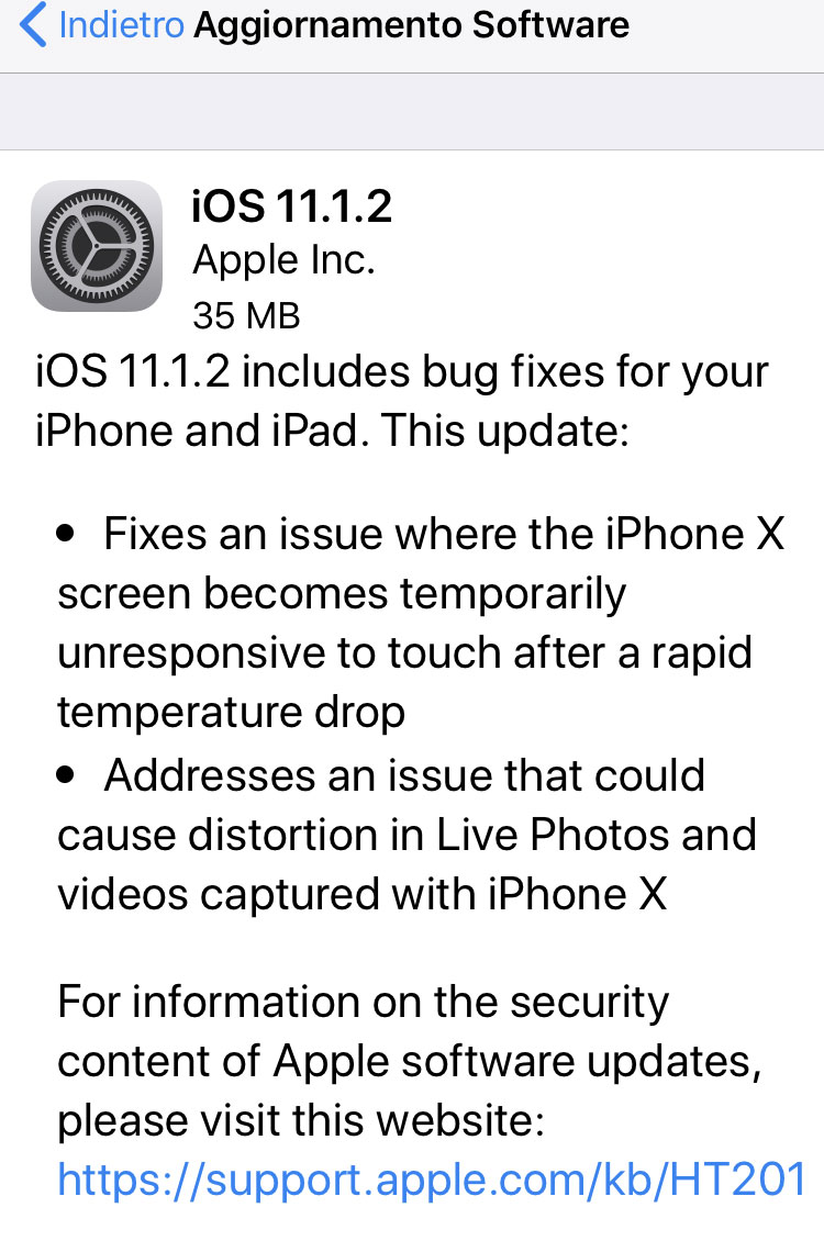 Apple ha rilasciato l’aggiornamento a iOS 11.1.2. L’update (se avete già installato i precedenti update a iOS 11.x) è di piccole dimensioni. Nelle note di rilascio Apple spiega che è stato risolto un problema per cui lo schermo di iPhone X poteva temporaneamente smettere di rispondere al tocco in seguito a un rapido calo della temperatura. È stato inoltre risolto un problema che poteva causare la distorsione di Live Photo e video acquisiti con iPhone X.