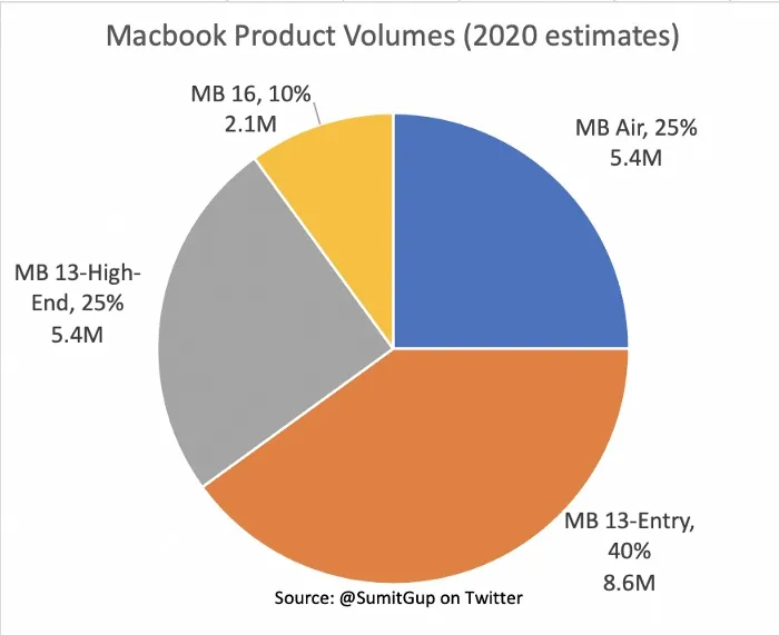 Occorre rilevare che numeri e stima sono per forza di cose molto approssimativi, come evidenzia Sumit Gupta, analista senior responsabile della strategia IBM AI, autore del mini report che senza dubbi solleverà un acceso dibattito. La prima stima indica un totale di 14 milioni di unità tra MacBook Air e MacBook Pro M1, presumibilmente le spedizioni totali dal lancio per l’anno fiscale 2021 che per Apple è già iniziato nel trimestre di ottobre, dedotte a partire dalle spedizioni del 2020.
