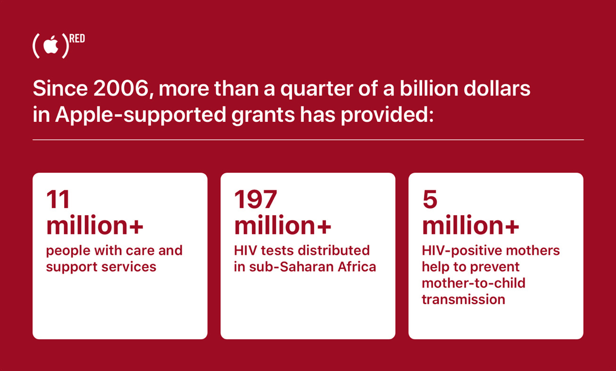 Fin dal 2006 Apple collabora e supporta Global Fund finanziando la lotta contro AIDS e HIV in Africa e nelle regioni più povere del pianeta donando una percentuale del fatturato dei prodotti (RED). La multinazionale annuncia che complessivamente dal 2006 a oggi le sovvenzioni di Apple ammontano a oltre 250 milioni di dollari.