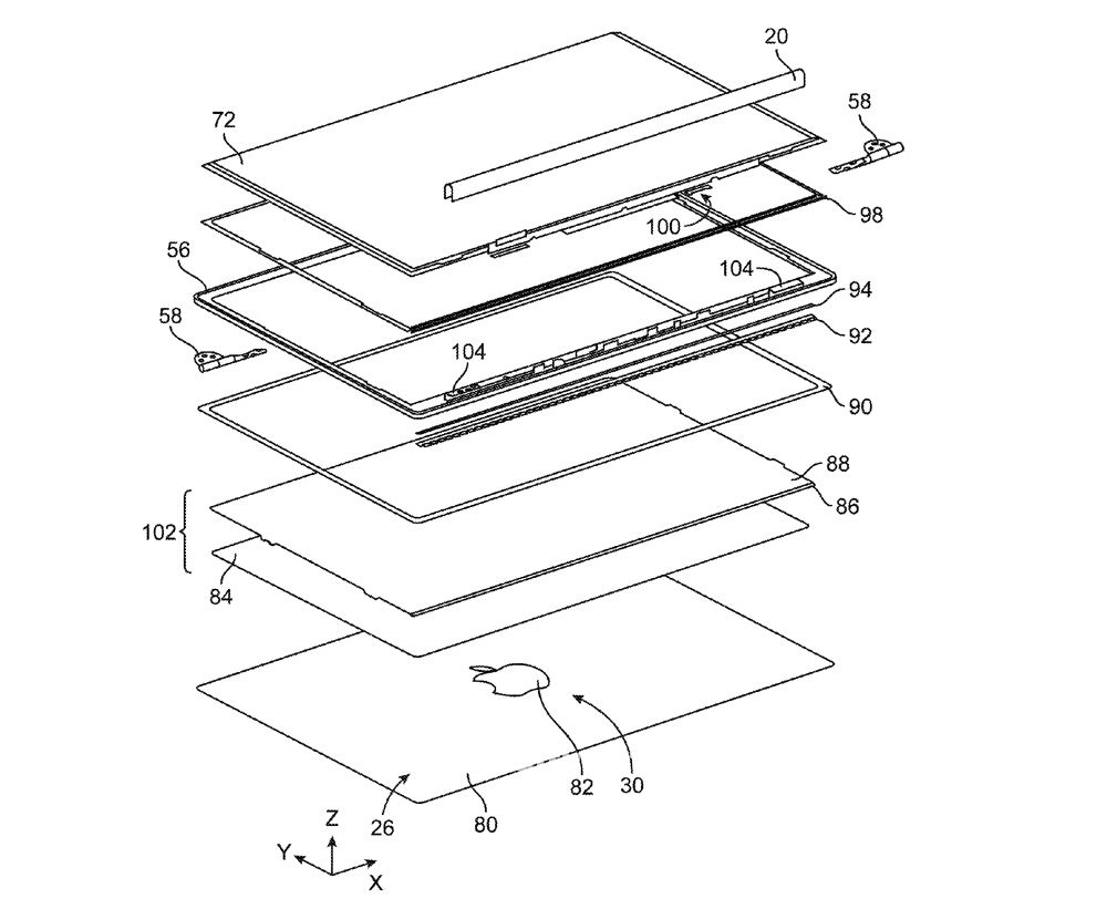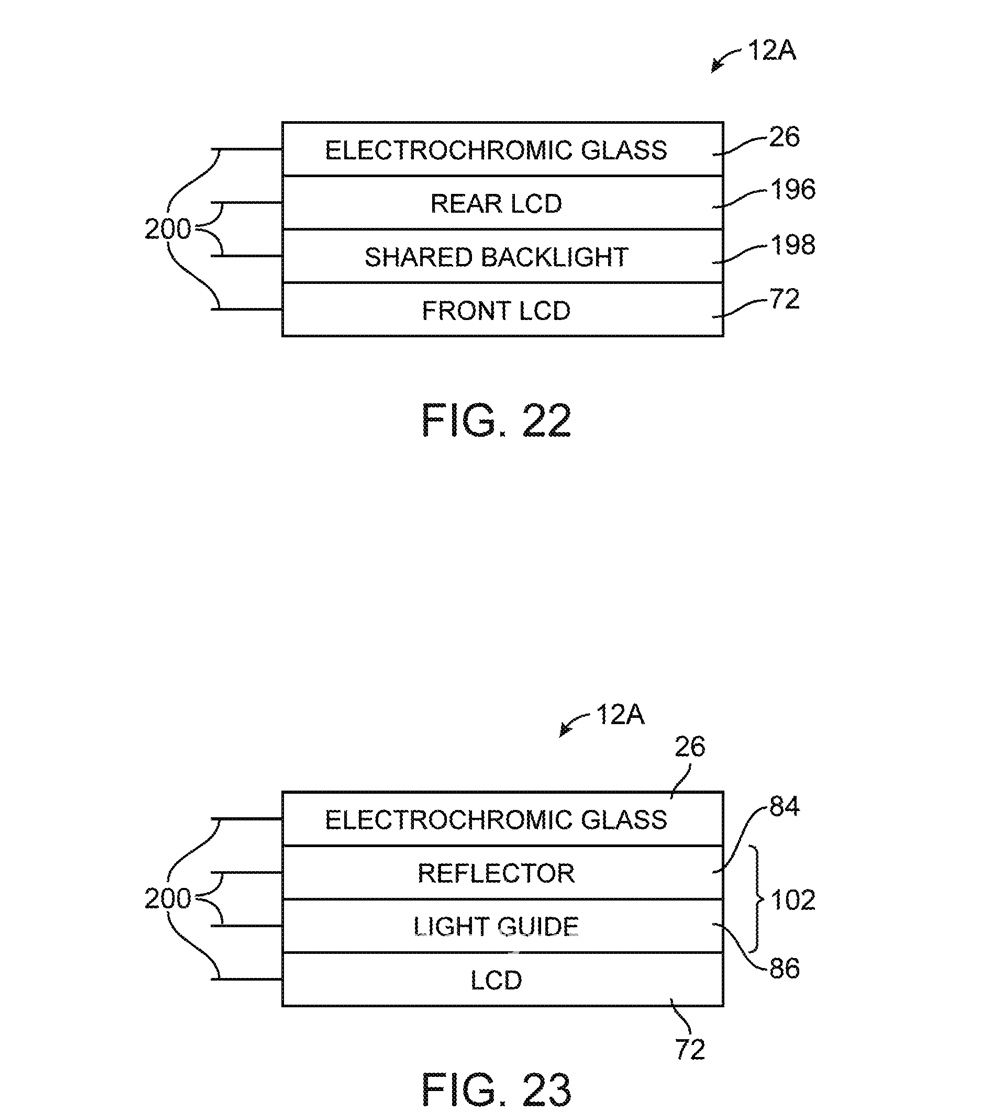 Interessante, invece, sono le indicazioni sull’utilizzo di materiali – settore sul quale Apple ha abituato negli anni a innovazioni che hanno segnato diversi mercati – e sull’alimentazione. Il MacBook a energia solare avrebbe sul guscio esterno delle cellule fotovoltaiche la cui funzione sarebbe quella di co-alimentare il dispositivo, allungando i tempi prima che sia necessario ricollegarlo alla rete elettrica. Almeno per la parte dello schermo non si utilizzerebbe più solo di alluminio, ma un mix di materiali: dalla ceramica, alle fibre composite e vetro. Nel brevetto, inoltre si parla di materiali “elettrocromici”, in grado, cioè, di cambiare colore e traslucenza in base alla luce esterna. Quando non è in funzione, quindi, lo schermo esterno del MacBook a energia solare non solo si spegnerebbe, ma diventerebbe opaco, lasciando in vista il logo con la Mela morsicata. Questo strato elettrocromico, inoltre, coprirebbe anche le stesse cellule fotovoltaiche, salvando così “la linea” pulita del computer.