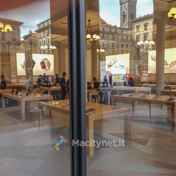 A una prima occhiata il nuovo Apple Store Firenze non sembra essere organizzato nel nuovo stile pensato da Angela Ahrendts e Jony Ive; quantomeno nel piano terra mostrato nelle immagini (il negozio potrebbe essere disposto su più piani), troviamo i consueti armadi con i prodotti appesi in fila anziché le nuove strutture organizzate in cassetti. I classici tavoli in legno sono affiancati dai nuovi banconi con vetrata che mostrano le varie collezioni di Apple Watch, dispositivi che sno mostrati anche nei display appesi alle pareti, confermando così la pronta disponibilità dei nuovi smartwatch fin dall’apertura.