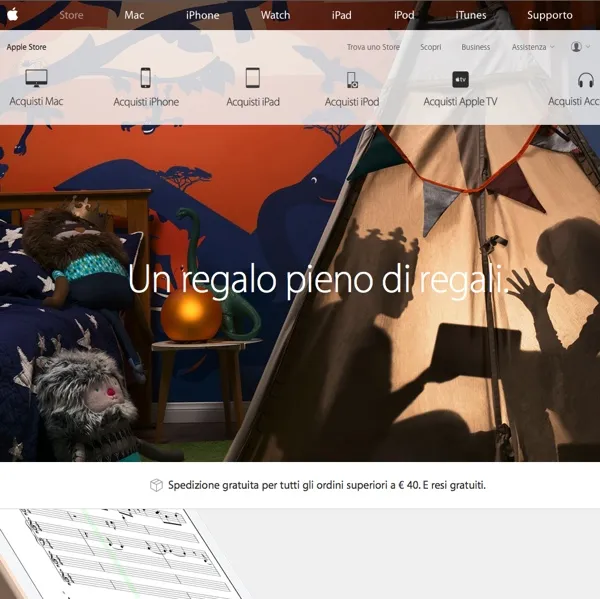Apple ha rinnovato completamente la pagina principale di Apple Store online. La nuova versione è disponibile oggi con grafica e impaginazione che si discostano molto dallo stile sobrio tradizionale: in calce in questo articolo riportiamo l’immagine principale in cui è anche visibile il nuovo strillo: “Un regalo pieno di regali”. Il cambio della vetrina di Apple Store online è stato realizzato in preparazione degli sconti in arrivo per il Black Friday, il weekend di sconti che inizierà in USA ma anche in Italia venerdì prossimo 28 novembre.