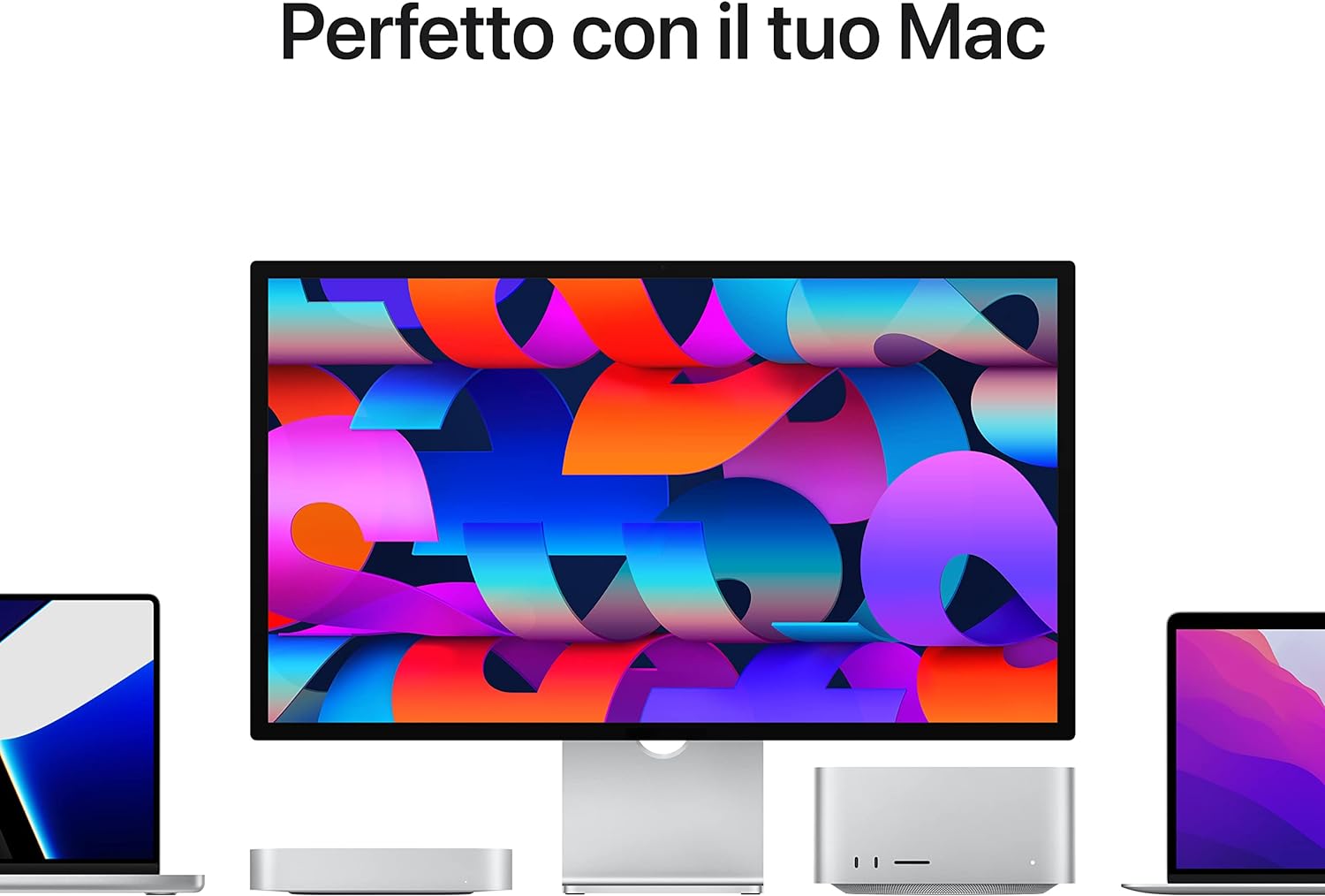 Il pannello è basato su un display Retina 5K da 27″con 600 nit di luminosità, ampia gamma cromatica P3 e supporto per oltre un miliardo di colori. Offre tecnologia True Tone, rivestimento antiriflesso.