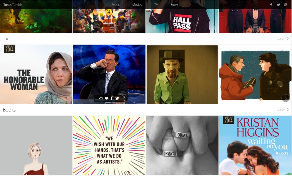 Più in basso la pagina mette in mostra artisti e cantanti con immagini fisse ma anche con GIF animate: lasciando fermo il puntatore per alcuni secondi sull’elemento desiderato gli utenti possono condividere al volo questo elemento inserendolo nel proprio feed Tumblr oppure segnalarlo come preferito, in alternativa condividerlo su Twitter e Facebook. Lo stesso vale per qualsiasi altro elemento della pagina Apple su Tumblr: lo sbarco della Mela su questa piattaforma social mette in risalto i migliori contenuti del 2014 per ogni categoria con musica, film, spettacoli ed ebook segnalati dalla redazione di iTunes Store.